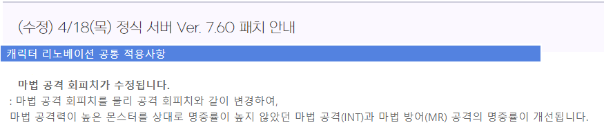 | 마법회피치 공식 변경 | INT에 대한 변화가 없으므로, 1.2×(AGI+회피율보정) + 15 + 1/7×(민첩성보정 |