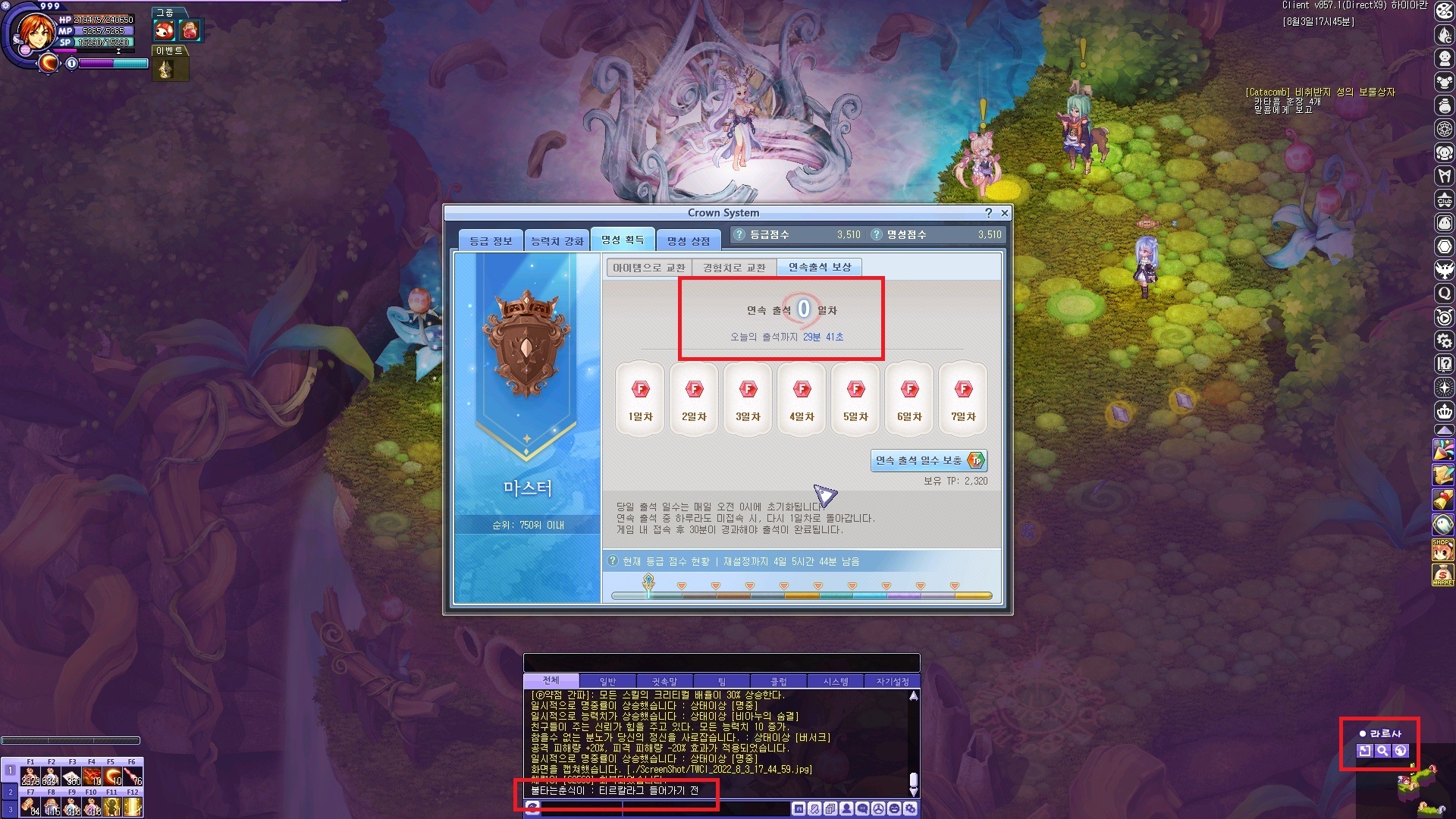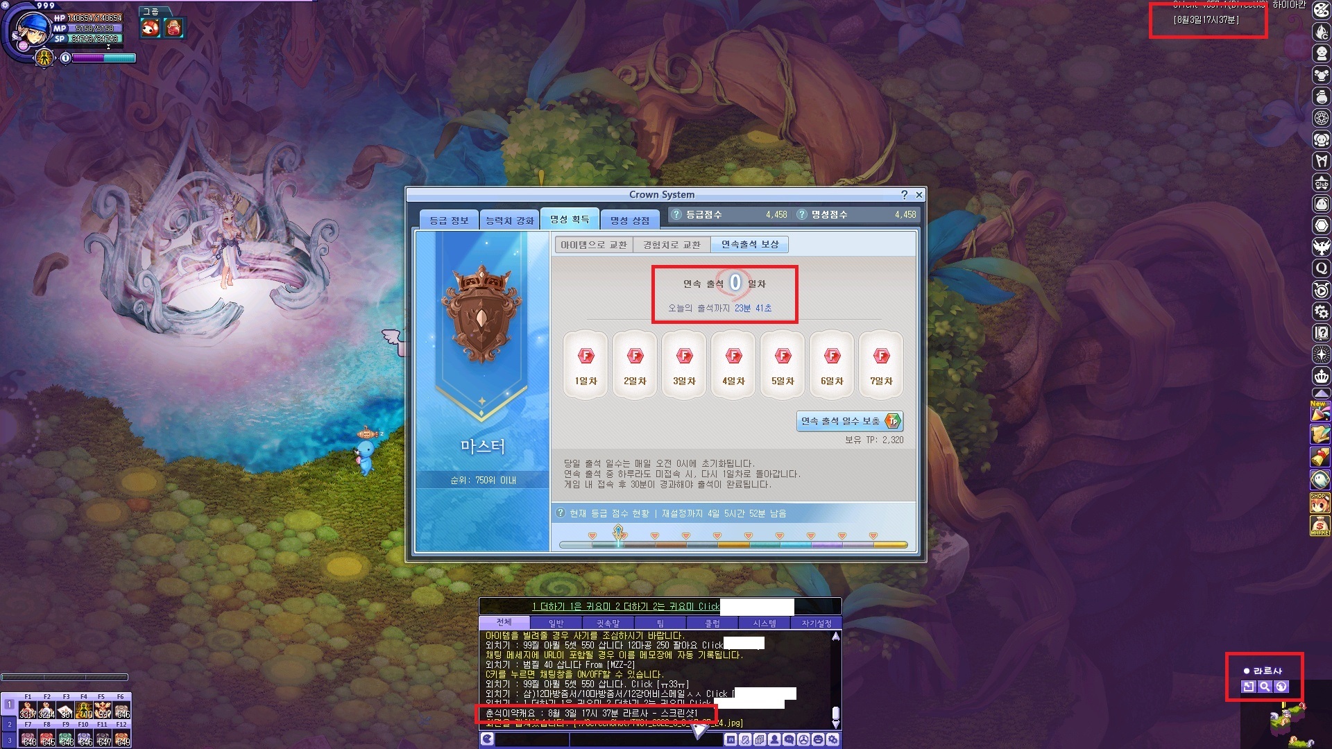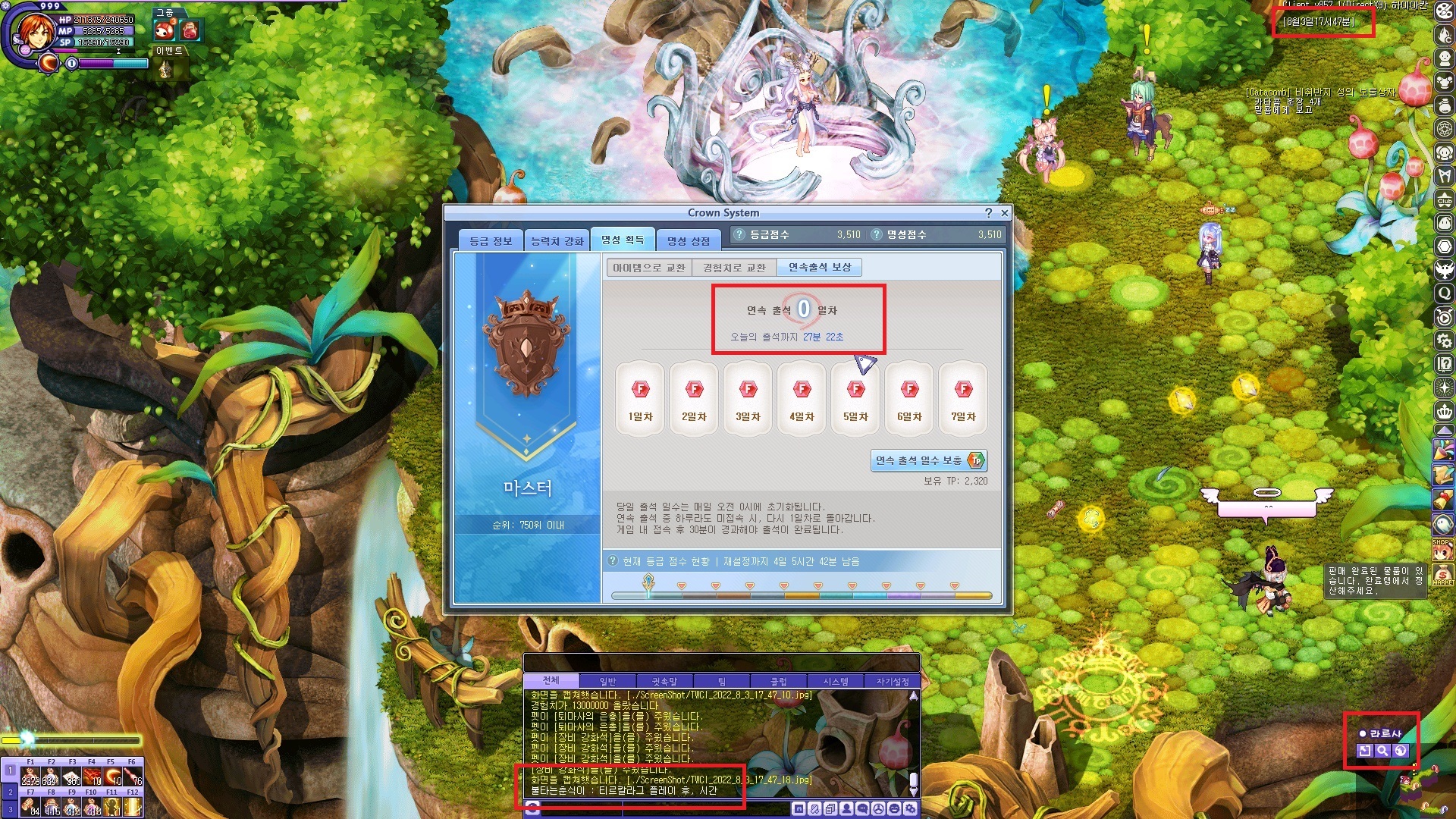 현재 크라운시스템 출석버그로 인해서, 지역서버 이동 / 지역 이동시 출석시간이 무한 초기화가 돼서