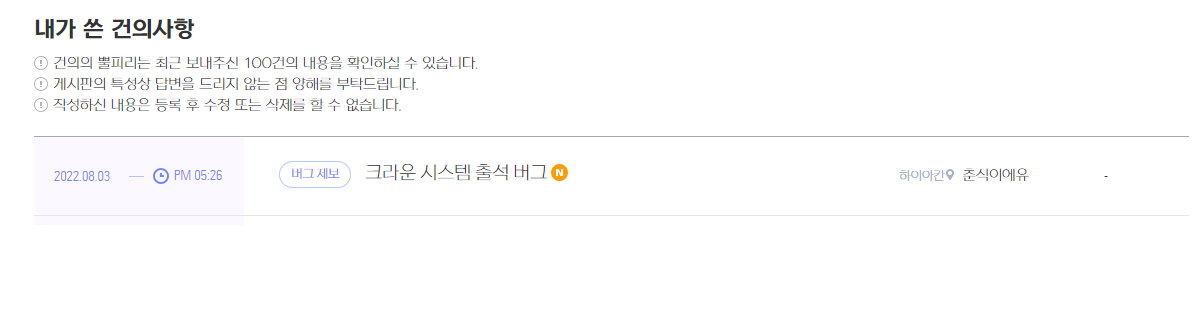 크라운시스템 출석 버그라고 버그신고를 통해 문의를 넣어놓은 상태인데 언제 고쳐질지 모르겠네요