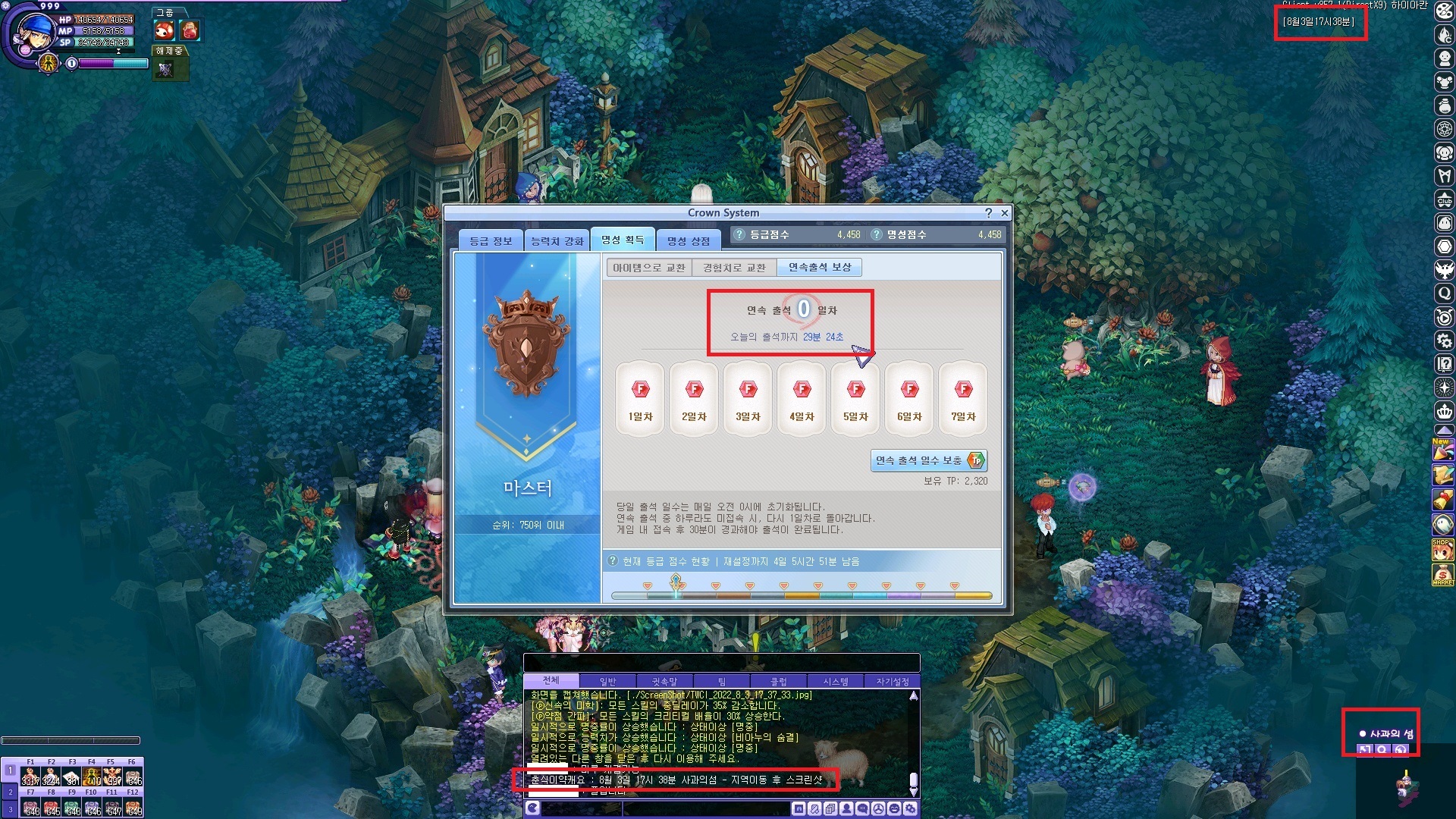 오른쪽사진처럼 사과섬으로 이동했을시, 출석 시간이 초기화 돼있는걸 확인할 수 있습니다.