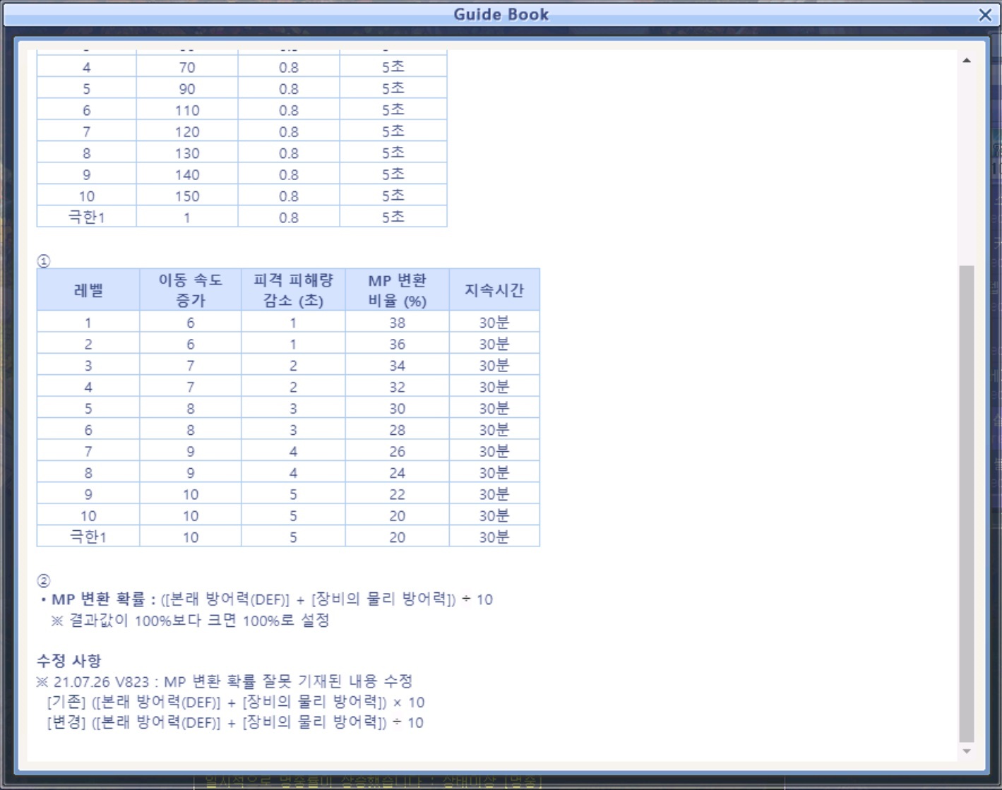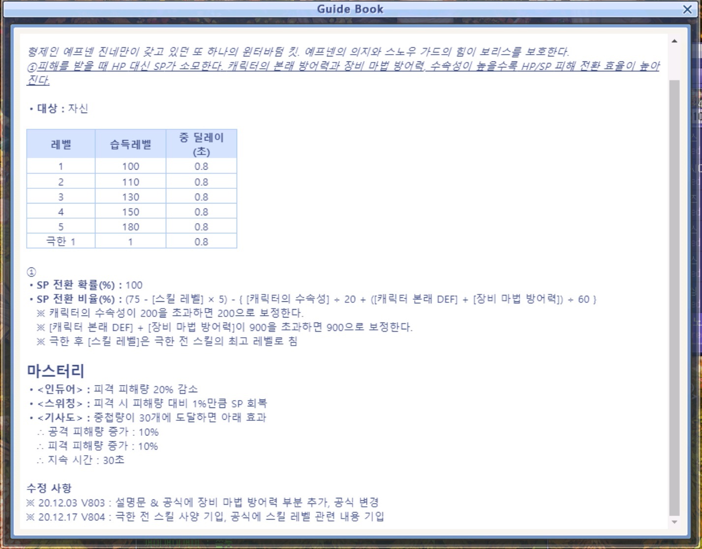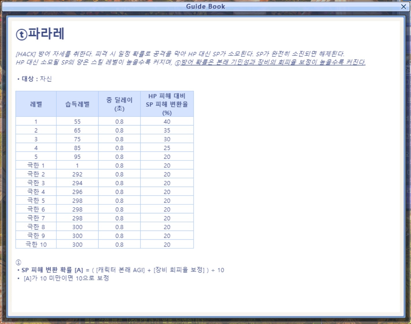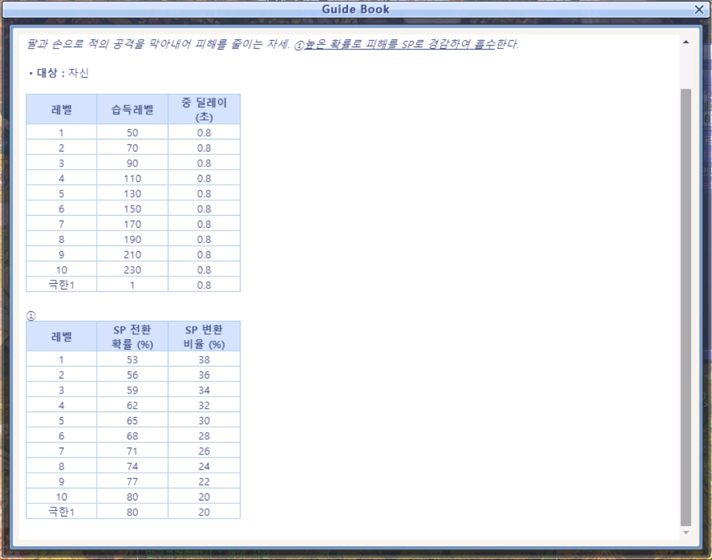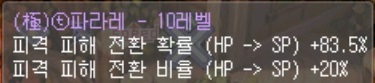 ex) 전환비율 20% 내가 데미지 10만을 입으면 데미지 80%를 경감을 시켜주고 SP가 2만이 닳음