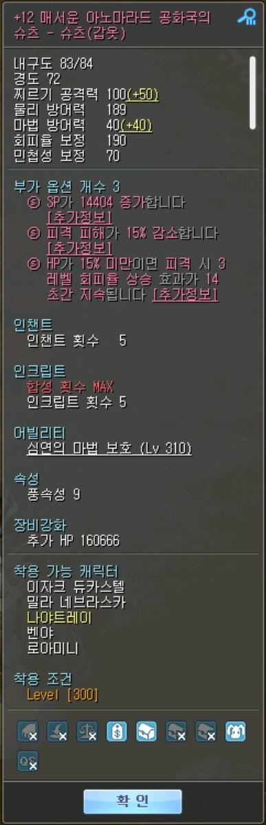 리체의 경우는 아노마라드 갑옷중 메일을 사용하지 않고 아머를 사용 시 발동확률 100% 가능 단, 크리/명중률 옵션을 버리기 때문에 어비스셋 이상일 시 추천