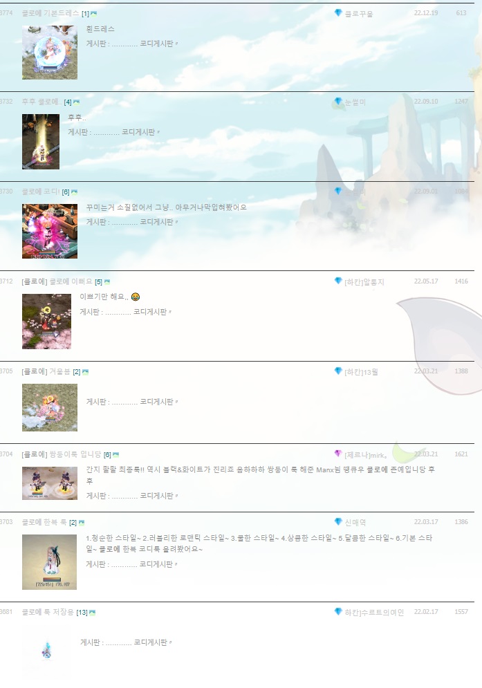 작성자앤킴우 작성시간 23.02.05 안녕하세요 클로에를 본캐로 시작하려는데 한복염색 색설정 어떻게하신건지 여쭤봐도 될까요!!!?? 너무이뻐서요ㅠㅠ