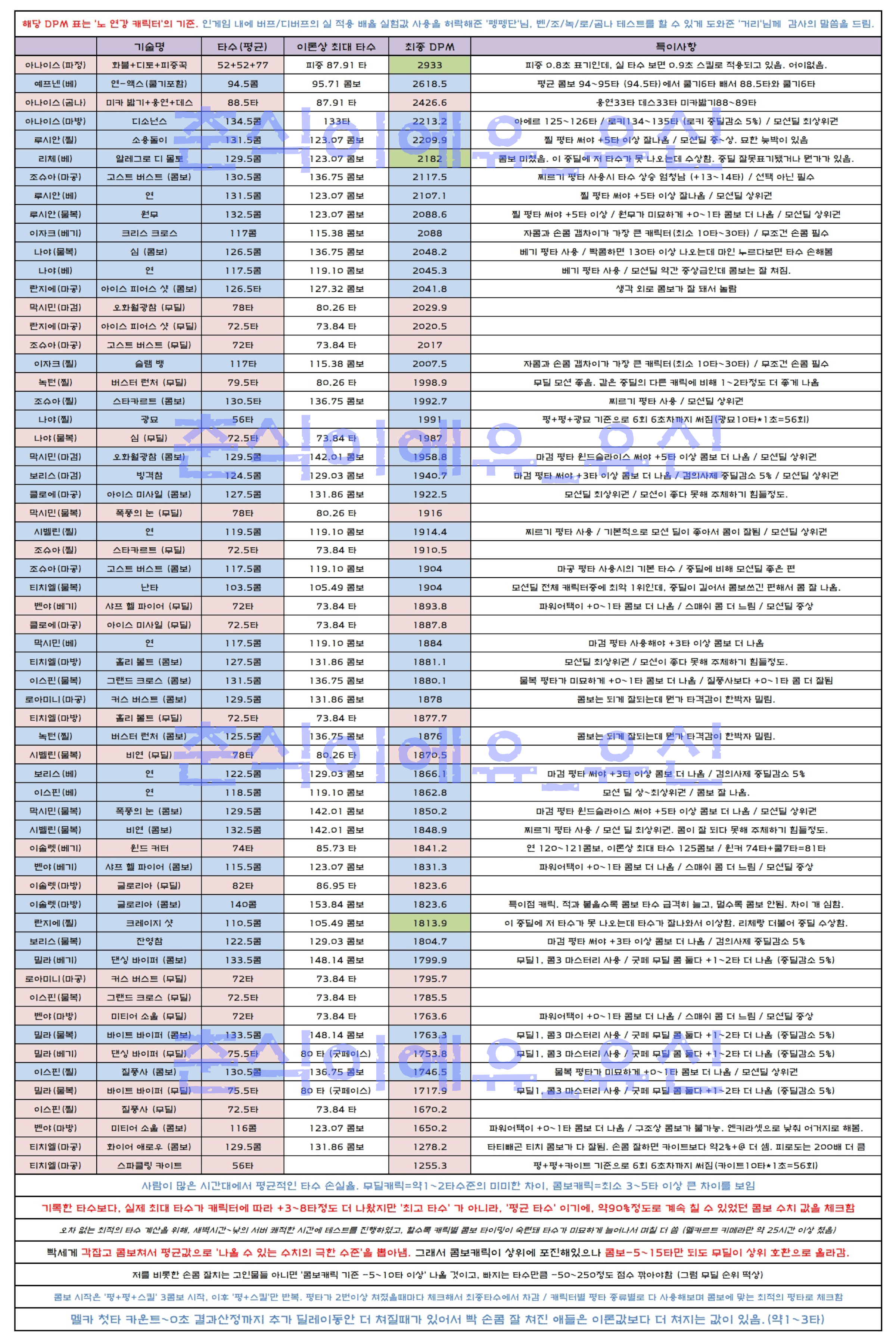 [알아봅시다〃][최신화] 캐릭터별 DPM 순위표 (노연강 기준 / 전캐릭 직접 무딜 손콤 테스트 / 결과값 반영) / 최종 수정