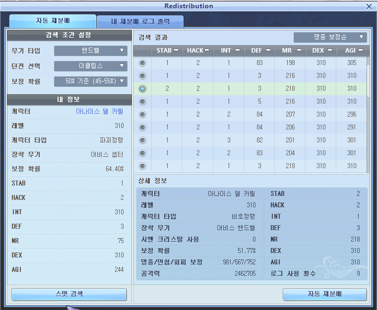 캐릭터 정보창 - 자동 재분배를 눌러 재분배 진행
