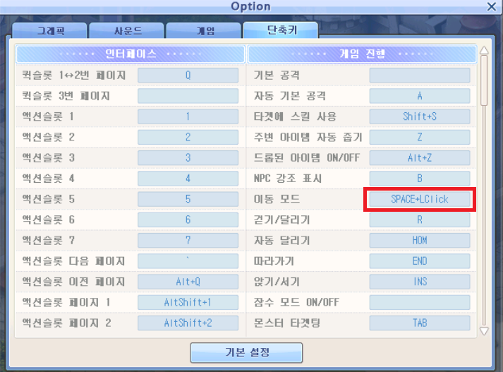 1. 테일즈위버 옵션 -> 단축키 -> 이동모드 -> SPACE+Click 으로 변경