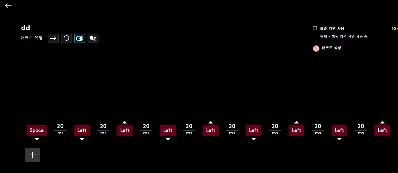 2. 로지텍 G허브 프로그램에서 아래와 같이 매크로 설정, 저는 G102 사용함, 스페이스바 떼는 버튼 삭제 필수
