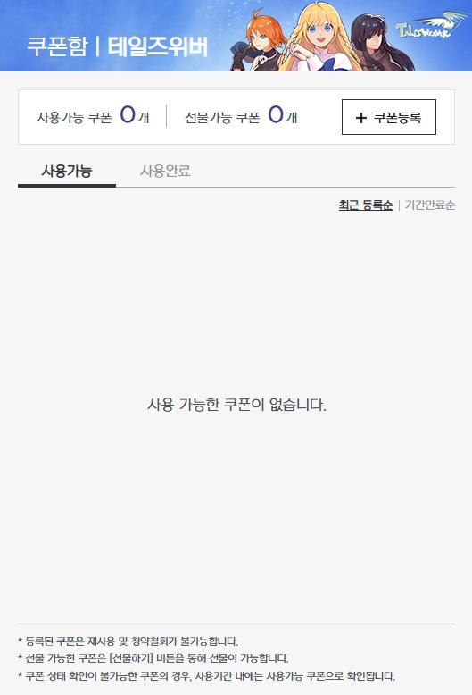 4. 게임 쿠폰이 발급되었습니다. 원하는 게임(테일즈위버) 쿠폰번호를 직접 복사(ctrl + C) 하거나, 우측에 복사하기 버튼을 클릭합니다.