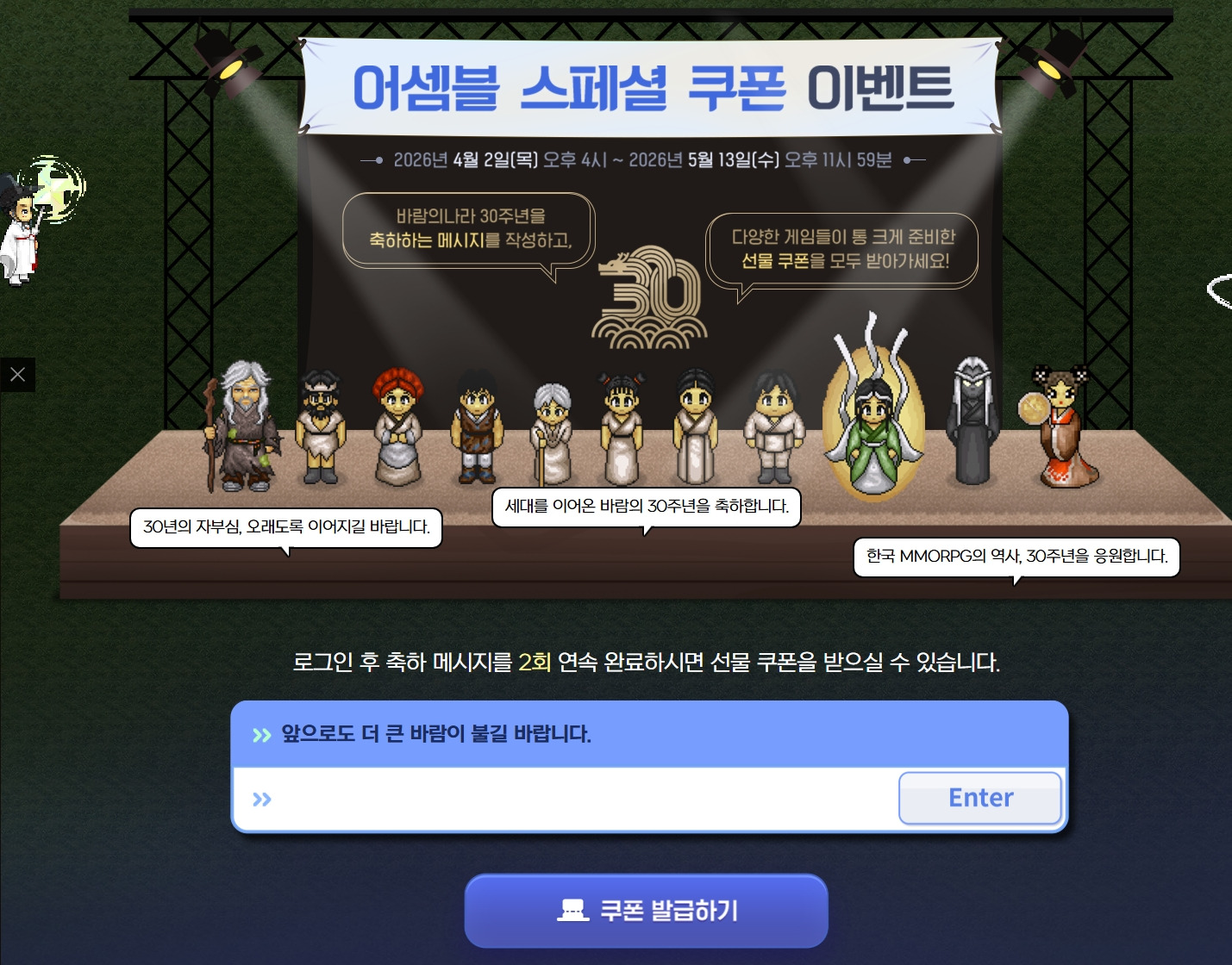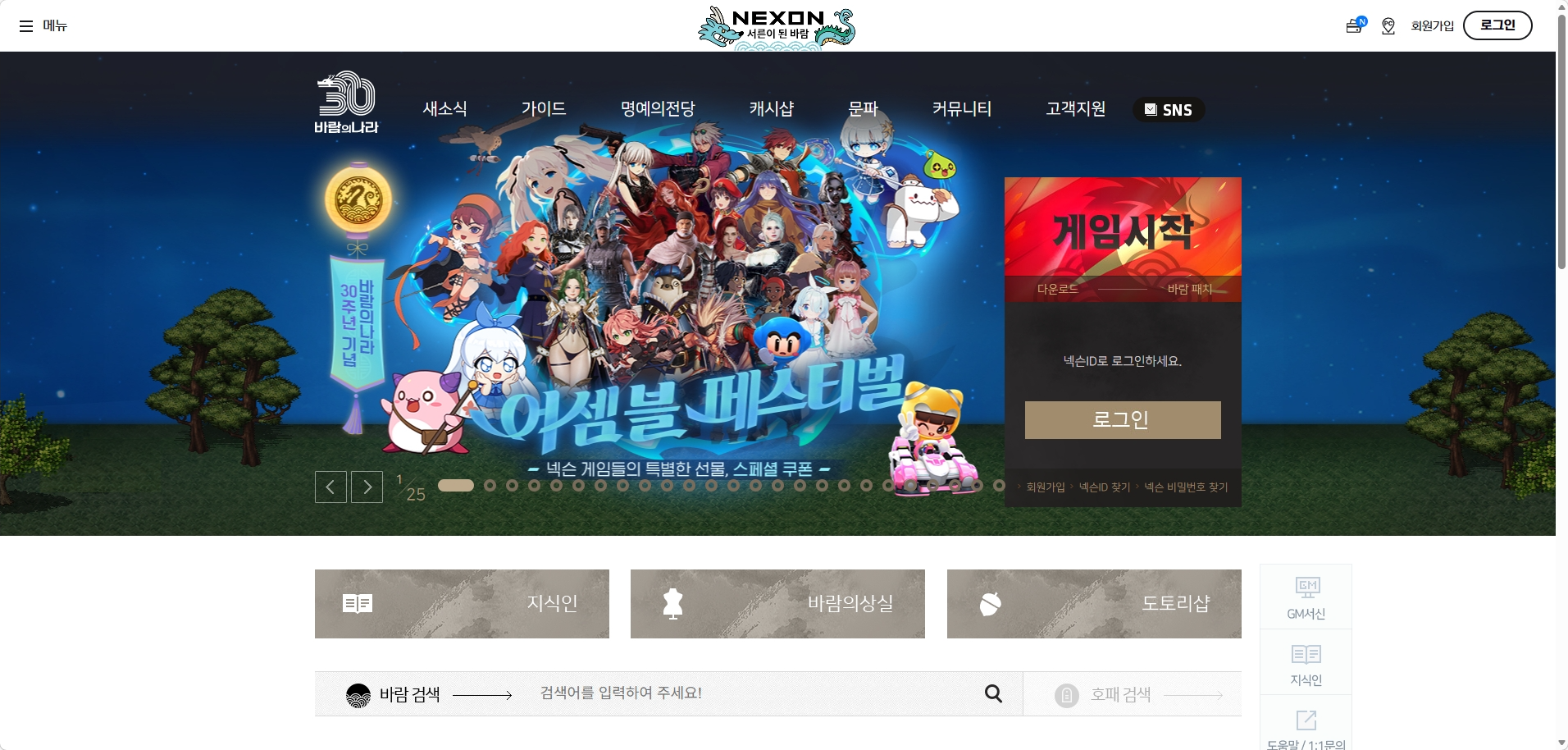 1. 바람의나라 공식 홈페이지로 이동하여 메인 화면에서 정면에 보이는 '어셈블 페스티벌' 부분 클릭하거나, 하단 링크 클릭.