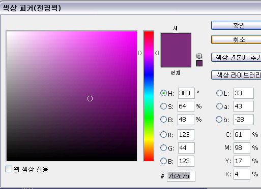 위의 색상의 RGB 코드를 보시면 R 123 G 44 B 123 라고 되어있습니다.