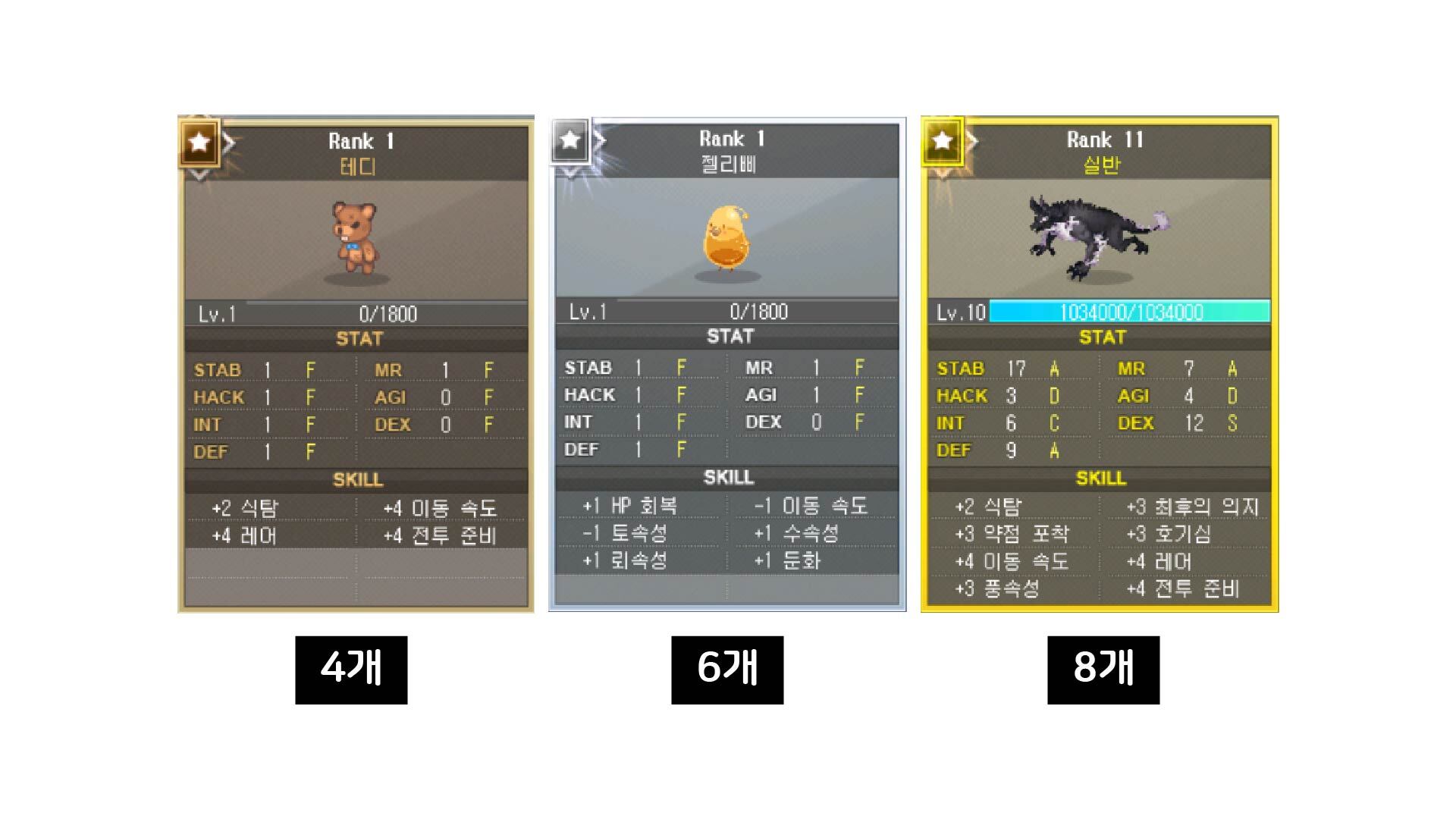 동카드는 최대 스킬이 4개, 은카드는 6개, 금카드는 8개의 스킬을 가지기 때문입니다.