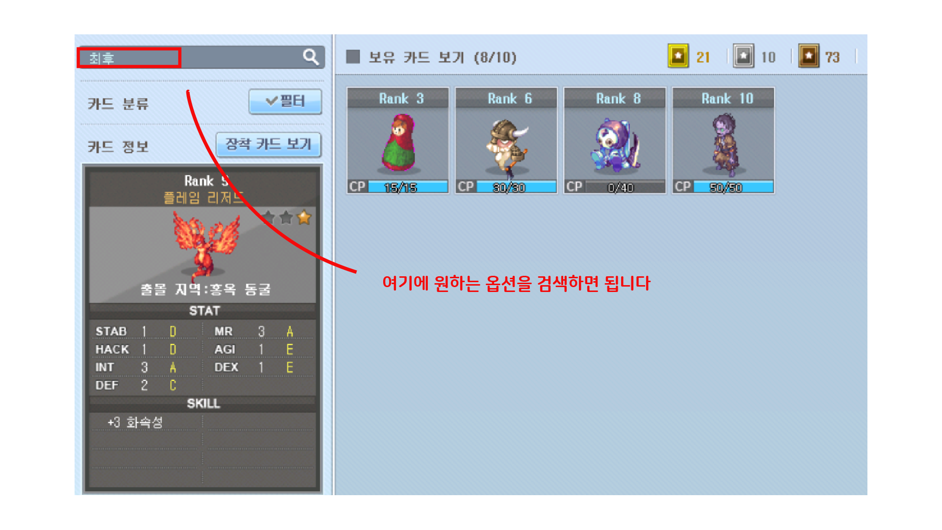 그렇다면 필요한 옵션을 가진 카드를 shift+K 를 눌러서 몬카창을 열고 검색해서 찾아내서 하나씩 조합해 나가면서