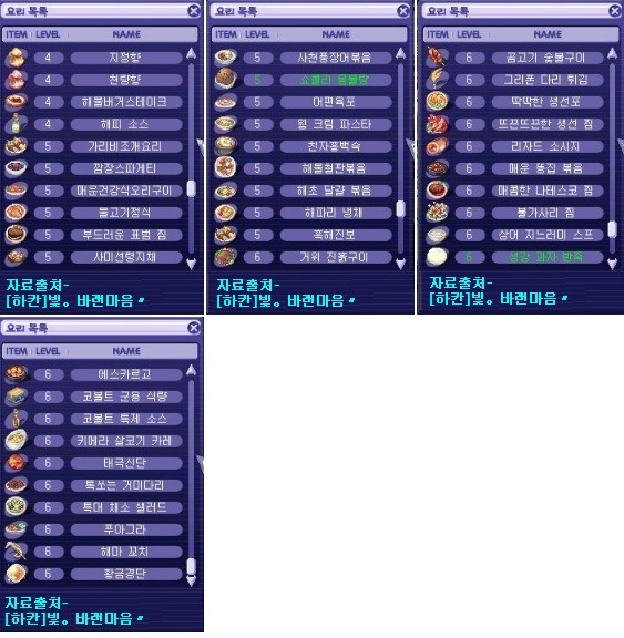 요리 104종 전체 효과량/재료 : http://cafe.daum.net/MagicWeaver/Q60A/13149