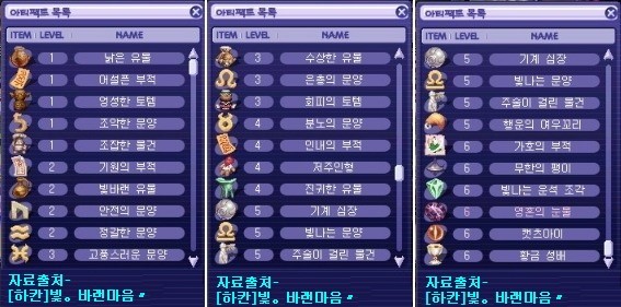 아티펙트 27종 전체 효과량/재료 : http://cafe.daum.net/MagicWeaver/Q60A/13152