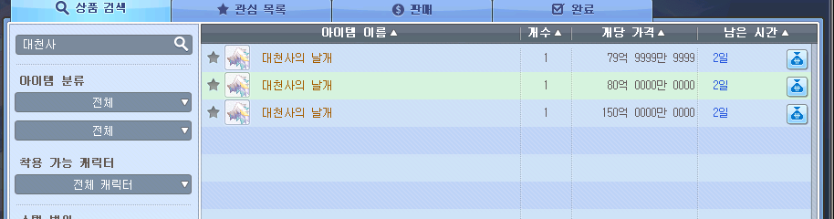날개는 무기보다 구하기가 까다롭습니다. 왜냐하면 공급이 거의 없고 기존 공급에서 판매가 이뤄지기에 부르는 게 값이 되어버렸습니다. 예를 들어 대천사의 날개는 80억의 가격을 형성하고 있습니다. 그렇다고 다른 날개를 구하자니 대부분 거래 시 전속되는 아이템으로 외변을 딸 수가 없습니다.