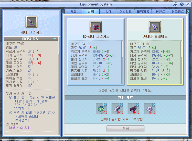 개고생을 했는데 정령의 신전 일반에서 장비를 분해하면 진화 재료를 얻을 수 있다는 고급 정보를 얻었으니 정령의 신전으로 넘어가 드랍되는 장비를 모두 분해해 원하는 아니마 블레이드를 손에 얻었습니다. (심지어 레테 크리시스도 드랍됩니다...)