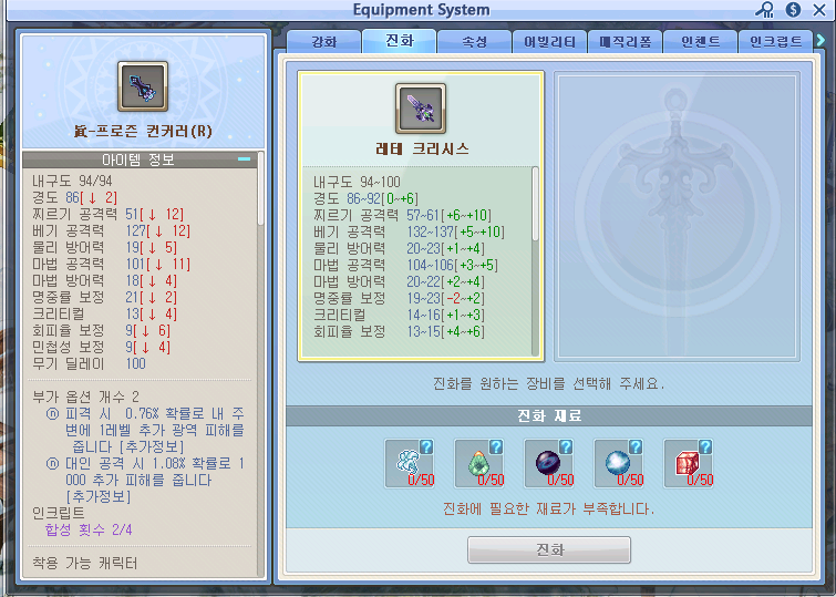 - 착용하고 있는 무기와 계열이 같아야 한다. ex) 대검->대검(O) 대검->태도(X)