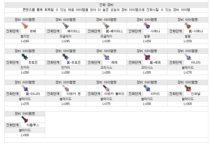 이 무기를 얻기 위해 프로즌 -> 크리시스 -> 아니마 블레이드 순으로 진화가 필요합니다. 직접 무기를 발굴해서 진화시키는 방법이 있고 드랍되는 아이템을 구하는 방법도 있습니다. 이는 테일즈위버 홈페이지 - 새 소식 - 개발자 노트 검색창에 '드랍'을 검색하면 원하는 무기를 찾을 수 있습니다.