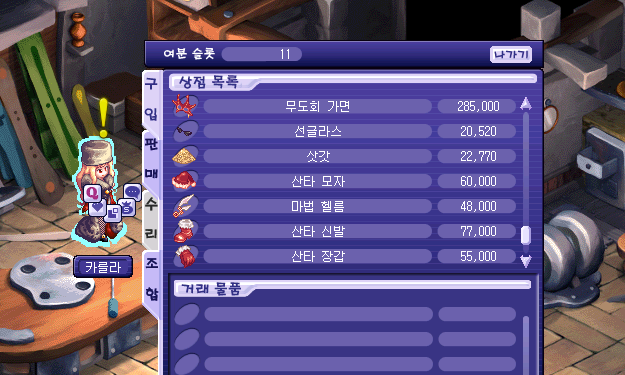 예를 들어 엘티보 마을 잡화점 NPC 카를라를 찾아가면 아래와 같은 아이템을 구할 수 있습니다.