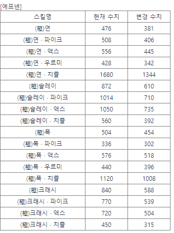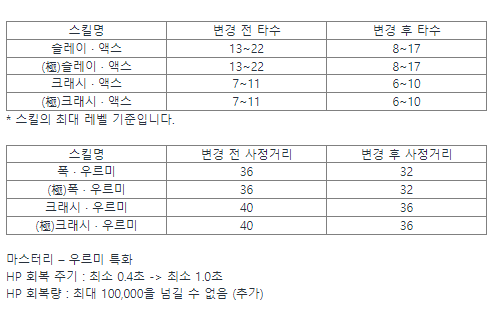 우르미 연(428->342) / 우르미 폭(440->396) 은 너프가 있는데