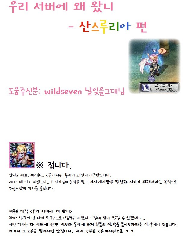 [1탄] 우리 서버에 왜 왔니 - 산스루리아 편 [Thanks to. WildSeven] 작성자[부지기]돼선자개구범|작성시간09.04.28|조회수6,664 목록 댓글 199 글자크기 작게가 글자크기 크게가 만렙 플러스 + 창、님 빼먹어서 죄송합니다 (__) ※와계님 아까 실수로 외계라고 썼는데 이해를 부탁드리겠습니다... 0131.mp3 첨부파일첨부된 파일이 19개 있습니다. jpg 파일 1.jpg 다운로드 jpg 파일 2.jpg 다운로드 jpg 파일 3.jpg 다운로드 jpg 파일 4.jpg 다운로드 jpg 파일 5.jpg 다운로드 jpg 파일 6.jpg 다운로드 jpg 파일 8.jpg 다운로드 jpg 파일 9.jpg 다운로드 jpg 파일 10.jpg 다운로드 jpg 파일 11.jpg 다운로드 jpg 파일 12.jpg 다운로드 jpg 파일 14.jpg 다운로드 jpg 파일 15.jpg 다운로드 jpg 파일 16.jpg 다운로드 jpg 파일 17.jpg 다운로드 jpg 파일 18.jpg 다운로드 jpg 파일 13.jpg 다운로드 jpg 파일 7.jpg 다운로드 mp3 파일 0131.mp3 다운로드 다음검색 현재 게시글 추가 기능 열기 북마크 공유하기 신고 센터로 신고 댓글 댓글 199 댓글쓰기 답글쓰기 댓글 리스트 답댓글 작성자[지기]돼선자개구범 작성자 본인 여부 작성자 | 작성시간 09.06.09 산스분이군요~ 반갑습니다. 작성자[트라]바 | 작성시간 09.06.14 역시 와세멋잇네여 ㅠㅠㅋㅋㅋㅋ 답댓글 작성자[지기]돼선자개구범 작성자 본인 여부 작성자 | 작성시간 09.06.27 레퀴엠도 멋있었어요 ㅋㅋ 답댓글 작성자트라]주차장 | 작성시간 09.06.27 풉 작성자[오를]물총새 | 작성시간 09.07.27 기사 잘봣습니다 ㅎㅎ ~ 댓글 전체보기