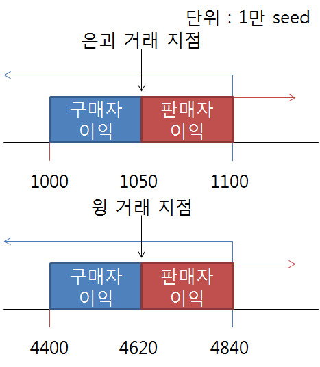 두 사람이 있다고 가정해 봅시다. 한 사람은 룰을 돌려야 해서 씨드는 필요한데 은괴로 돈을 들고있는 사람(A), 한 사람은 5천만 씨드 이상의 고가의 템을 사기 위해 씨드를 고가의 화폐로 환전해야 하는 상황(B)입니다. A가 은괴를 상점에 팔 경우 얻을 수 있는 건 1000만 씨드, B가 상점에서 은괴를 살 경우 내는 씨드는 1100만 씨드입니다. 둘 다 개인적으로 손해를 봤다고 생각하겠죠. A나 B나 사람이라면 수수료 떼이기 싫은건 마찬가지일테니까요. 그런데, A와 B가 만나 우연히 1050만에 은괴를 거래하기로 합니다. A는 룰을 더 돌릴 수 있을 것이고 B는 싼 값에 은괴를 살 수 있게 됩니다. 서로 누이좋고 매부 좋은것이죠.