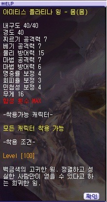 이 아미티스 플라티나 윙(이하 '윙')은 아미티스 요새를 점령한 클럽의 클럽원에게 한정된 시간(!)동안 4400만 씨드에 판매되는, 나름대로 한정판 템입니다. 일단 원가가 4400만이니, 성을 점령해서 이 윙을 외부에 파는 사람 역시 4400만에 윙을 사서 4400만 이하에 윙을 파는 아름다운 짓(?)을 하진 않겠죠. 따라서, 윙은 최소한 4400만 이상에 플리마켓에서 성 클럽원에게 구매하실 수 있습니다.