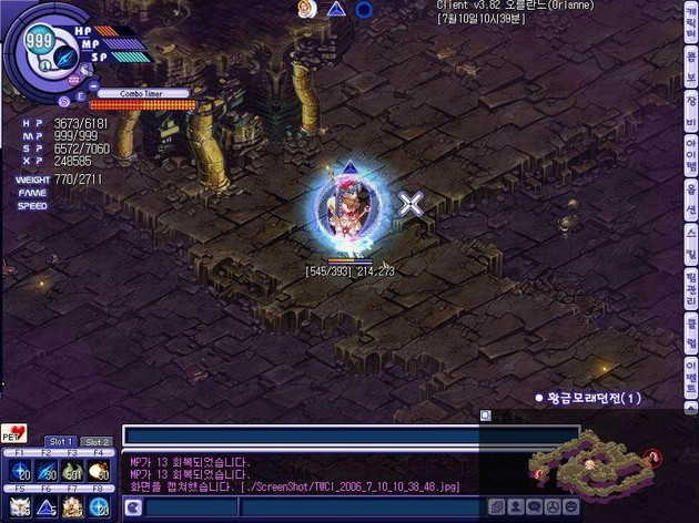 공략 : 황금모래던전 3층입니다. 앞에서도 달리기 좀 했던 곳이죠;; 여기는 한 쪽으로 몰려가서 끝방의 몬스터를 전멸시키고 반대쪽으로 가서 다시 끝방의 몬스터를 전멸시키면 워프포탈이 열리는 형식입니다. 파티 찢지 말고 무조건 몰려다니는 것이 좋을겁니다.