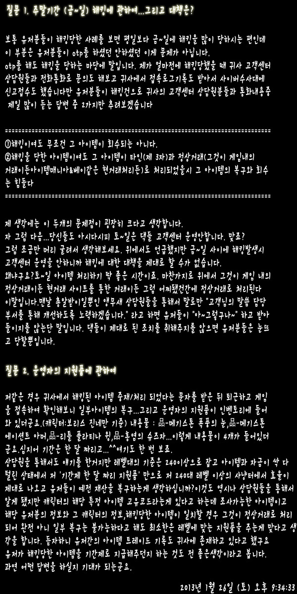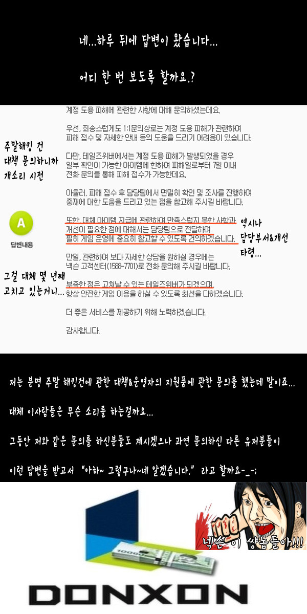 [[브금有]][약스압/실험/징징]넥슨에게 징징거려 보았습니다. 작성자[아노]주다스|작성시간13.01.27|조회수487 목록 댓글 1 글자크기 작게가 글자크기 크게가 라~는~ 반 동문서답 답변을 받았습니다-_- 아무튼 넥슨이 제대로 된 답변을 한다는건 위 짤방과 같습니다.-_- 한석규실성.swf 첨부파일첨부된 파일이 4개 있습니다. jpg 파일 징징글.jpg 다운로드 jpg 파일 개소리시전.jpg 다운로드 jpg 파일 그런건~1.jpg 다운로드 swf 파일 한석규실성.swf 다운로드 다음검색 현재 게시글 추가 기능 열기 북마크 신고 센터로 신고 댓글 댓글 1 댓글쓰기 답글쓰기 댓글 리스트 작성자[아노]Repel月 | 작성시간 13.01.28 저도 금요일날털린적이상당히많은... 댓글 전체보기