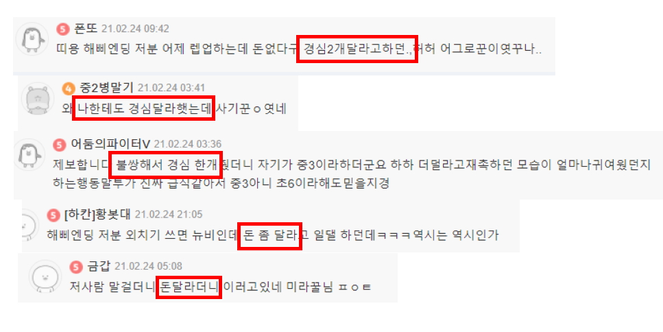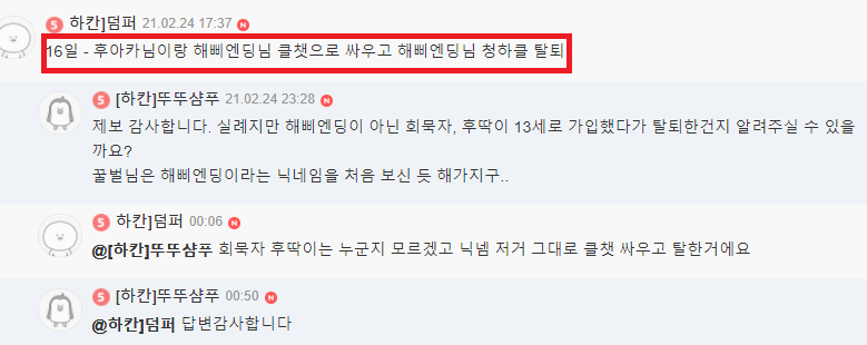 2월 7일 ~ 2월 16일까지의 해삐엔딩 어그로는 딱히 없는 듯 합니다. 오소리님과 제 글의 댓글을 보아하건데 아마도 해삐엔딩은 2월16일 청하클 탈퇴를 기점으로 각종 어그로 및 후아카 사칭을 시도한 것으로 보입니다.