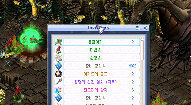 처음에 등장하는 마법 솥단지에 재료를 드레그해서 마법 솥단지 이름이 뜨게 바닥에 뿌려주면 됩니다