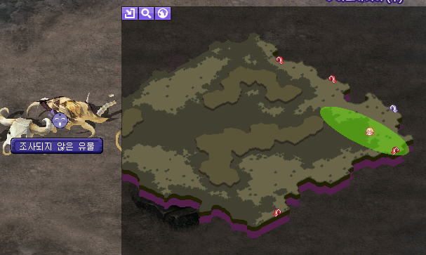 맵에 초록색으로 표시된 부분을 돌다 보면 ' 조사되지 않은 유물 ' 이 존재함 한 번씩 클릭해주면 퀘스트 완료