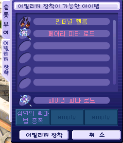 인벤토리 -강화 -어빌리티를 눌러 왼쪽에 페어리 피타 로드 등록