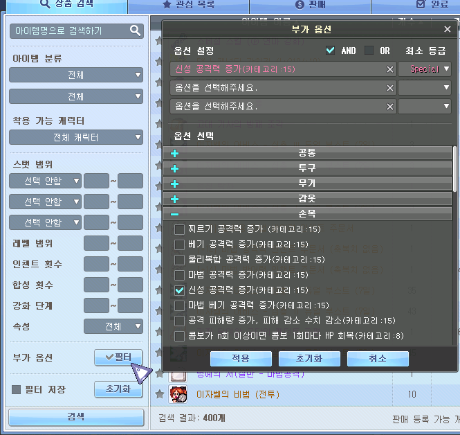 아이템 거래소에서 왼쪽 하단 필터를 눌러 손목을 누르고 신성 공격력 증가 체크