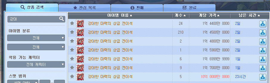 아이템 거래소에서 강대한 마력의 상급 전이석 2개를 구매하고 ( 약 3억 )