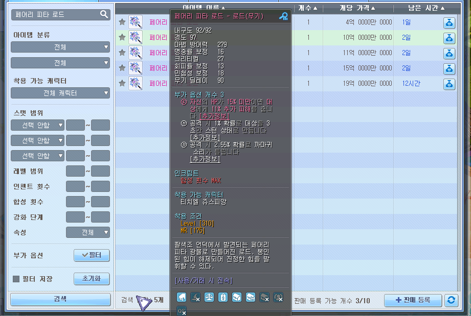 아이템거래소(G)에 페어리 피타 로드를 검색