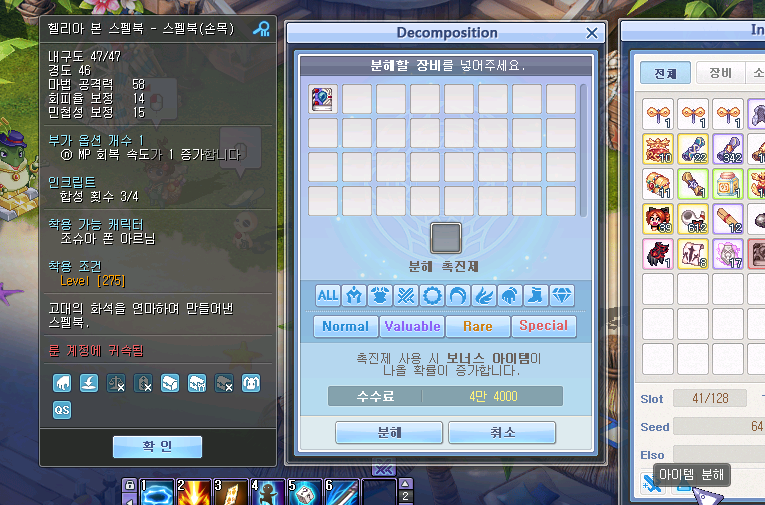 인벤토리에서 더블클릭 후 마법방어를 선택 300개를 페어리 피타 로드에 써주세요