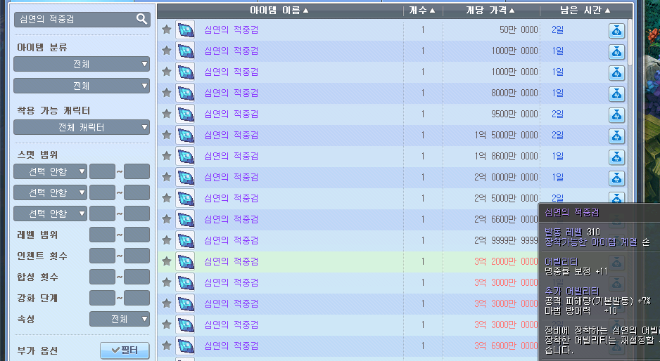 아이템 거래소를 눌러 심연의 적중검 검색 후 마우스 오른쪽을 클릭