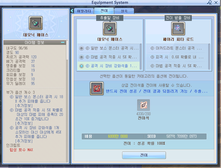 ( 강대한 마력의 상급 전이석이 너무 비싸다면 찬란한 상급 전이석을 쓰셔도 됩니다! 실패하면 전이석 사라짐- 장비는 남아있음 )