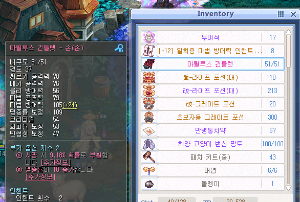 인벤토리의 부여석을 아퀼루스 건틀렛에 사용 후 필요없는 부가옵션이 있는 여유 선택지 클릭