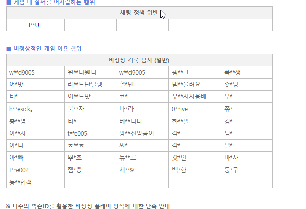 제재당한아이디:와이쏘시리어스/쵸랭/후단스/크로마뇽/웨펀/하얼빈쯩횬/솔플러에요/뿌곱초/햄찌쁑/wind9005/wlnd9005/헬프넨