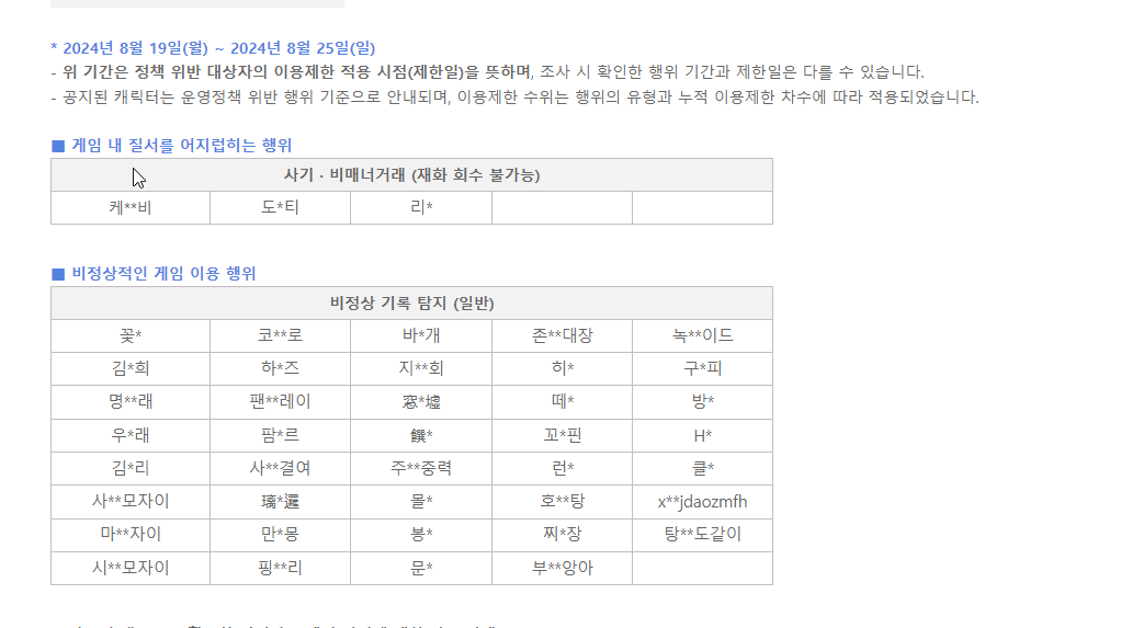 제재당한아이디:와이쏘시리어스/쵸랭/후단스/크로마뇽/웨펀/하얼빈쯩횬/솔플러에요/뿌곱초/햄찌쁑/wind9005/wlnd9005/헬프넨/러셀