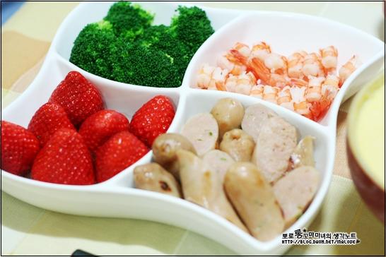 퐁듀재료들 : 단맛이 안나는 밍숭맹숭 과자, 담백한 브래드스틱, 삶은 새우, 데친 브로콜리, 싱싱한 딸기, 매운 청량고추맛 소세지