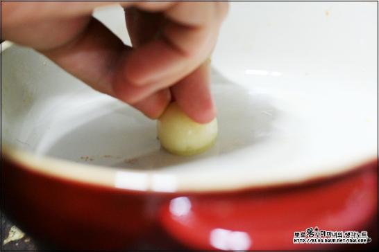 미리 데펴놓은 퐁듀용 그릇에 마늘을 반으로 잘라 잘린 단면이 바닥에 닿도록 한뒤에~