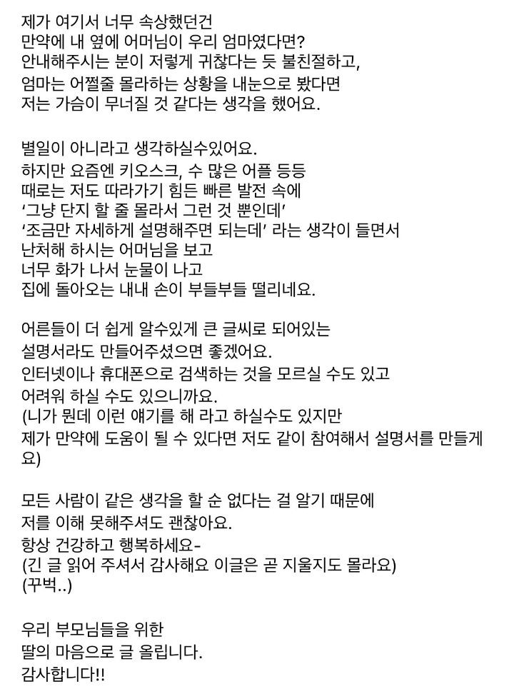 답댓글 작성자E재명 대통령 작성시간 24.04.24 물론 키오스크 사용 이런거는 어르신들이나 나이든 분둘 서투를 수 있는데