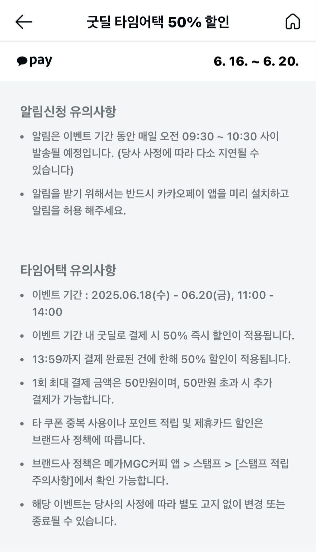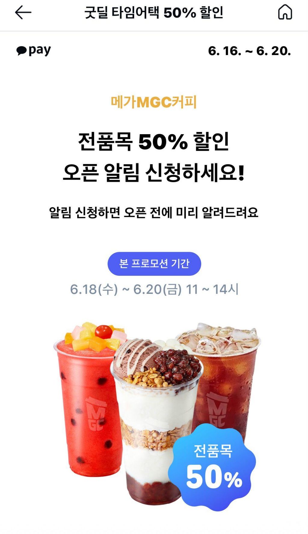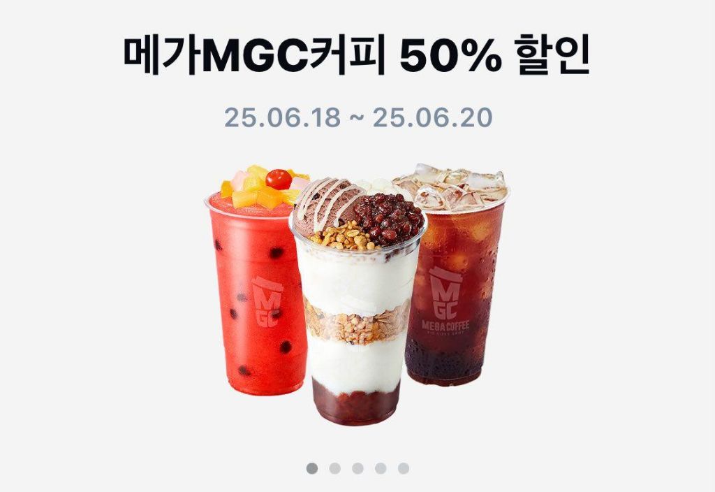 [기타]카카오페이 한정) 오늘부터 3일 간 메가커피 전품목 50%할인 오전 11시-오후2시까지 작성자지형주|작성시간25.06.18|조회수866 목록 댓글 9 글자크기 작게가 글자크기 크게가 다음카페 뒷골목 연구소결제 방법이 따로 있음!!!(좀 귀찮음 주의)메가커피 50%할인이벤트06.18(수)~06.20(금) 11~14시전품목 50% 카카오페이 > 굿딜 >메가MGC커피 > 매장결제시 “모바일상품권” 선택하고 바코드 결제🚨중요🚨카카오페이 결제오전11시 – 오후 2시(13시 59분 결제)이벤트는 당사의 사정에 따라 별도 고지 없이변경 또는 종료 될 수 있음조기에 종료될 수 있음!!!팥빙도 된다!!! 다음검색 현재 게시글 추가 기능 열기 북마크 공유하기 신고 센터로 신고 댓글 댓글 9 댓글쓰기 답글쓰기 댓글 리스트 작성자로제니아 | 작성시간 25.06.18 오 대박 작성자미애 | 작성시간 25.06.18 오 좋다 작성자@kimyk_10 | 작성시간 25.06.18 ㄷㅂ 오늘 먹어야지 작성자이창섭 | 작성시간 25.06.18 헉 ㄱㅅㄱㅅ 메가 뭐가 맛있지 작성자밀감 | 작성시간 25.06.18 헐 전품목이면 텀블러나 머그컵도 할인되려나.. ㄱㅅㄱㅅ 댓글 전체보기