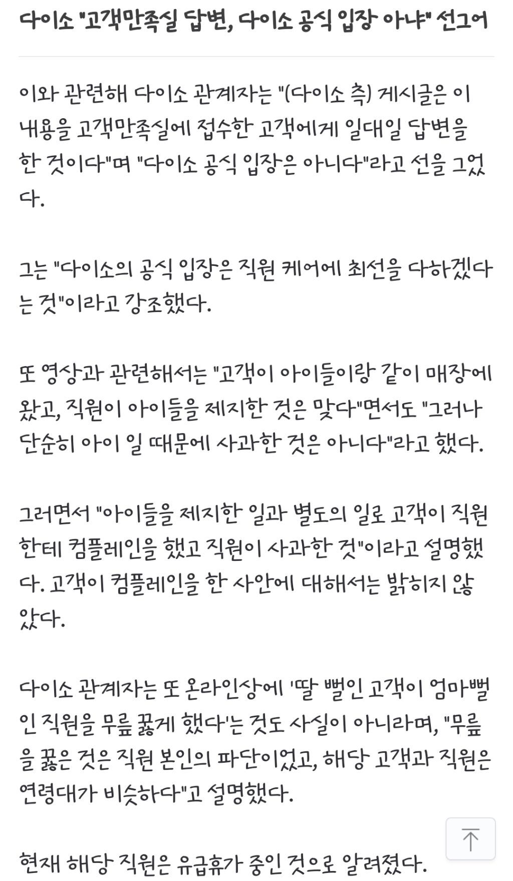 [기사]'직원 무릎 꿇린 갑질 고객' 다이소가 형사 고소?…알고 보니 다이소 공식입장 아냐 작성자내일부터야구안본다|작성시간25.11.27|조회수4,338 목록 댓글 4 글자크기 작게가 글자크기 크게가 다음카페 뒷골목 연구소 https://n.news.naver.com/article/003/0013626345?sid=102'직원 무릎 꿇린 갑질 고객' 다이소가 형사 고소?…알고 보니전남의 한 다이소 매장에서 직원이 손님에게 무릎을 꿇고 사과하는 장면이 포착돼 '갑질 논란'이 일고 있다. 지난 21일 한 소셜미디어(SNS)에는 ‘다이소 맘충 진상’이라는 제목의 글과 영상이 n.news.naver.com기사들어가서 본문으로 확인해줘다이소 감다죽 ㅁㅊ 다음검색 현재 게시글 추가 기능 열기 북마크 공유하기 신고 센터로 신고 댓글 댓글 4 댓글쓰기 답글쓰기 댓글 리스트 작성자金軟景 | 작성시간 25.11.28 앵 작성자참돼 | 작성시간 25.11.28 엥 왜 구구절절 변명 작성자팜하니 | 작성시간 25.11.28 엥 답변 개짜친다 작성자오후 | 작성시간 25.11.28 홍보팀 뭐해 ㅠ 댓글 전체보기
