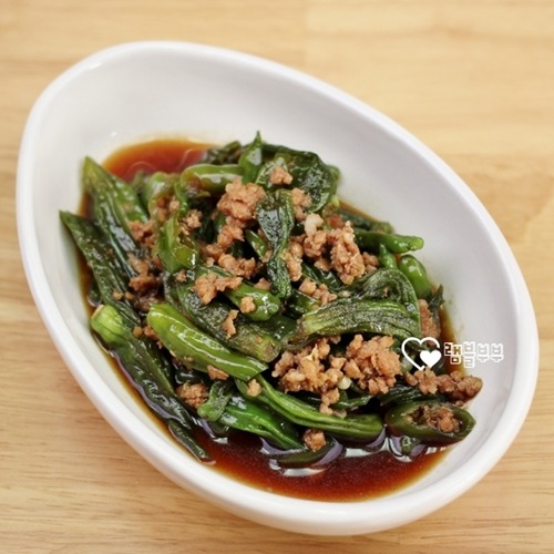 오~~~ 밥도둑 밑반찬 꽈리고추조림이에요!!! 만능간장에 들어 있는 돼지고기가 강정처럼 맛나요~