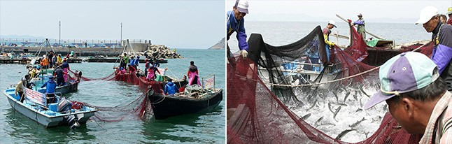 오랜 경험을 가진 어로장이 산 중턱에서 숭어 떼가 몰려오는 것을 눈으로 확인 후 어선에 신호를 보낸다. 이때를 기다리고 있던 대여섯 척의 어선들이 일제히 빠른 속도로 돌면서 그물을 펼쳐 숭어 떼를 둘러 싼 뒤 그물을 거둬들인다.