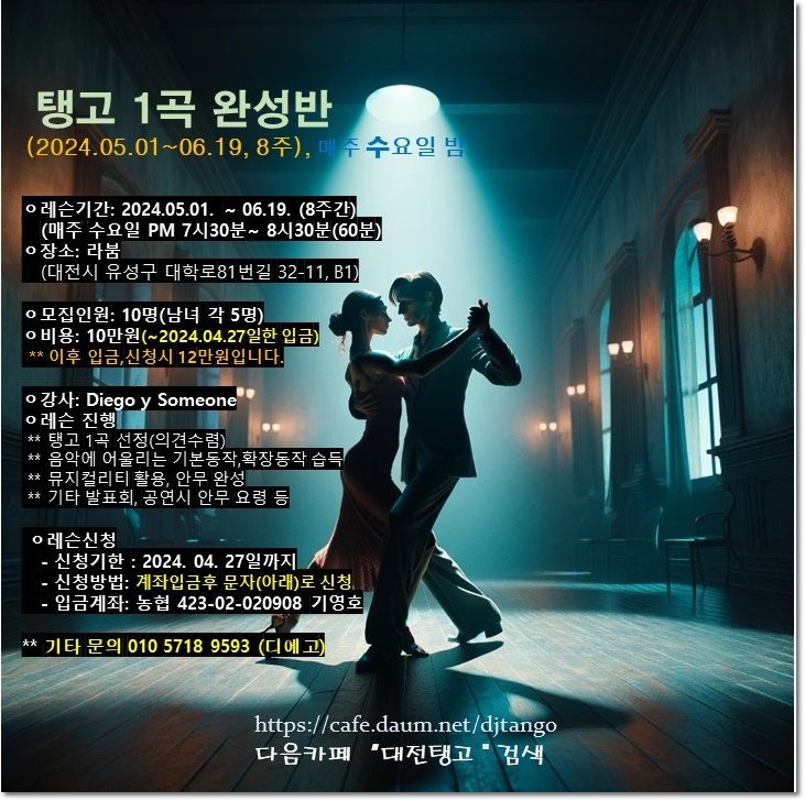 탱고 1곡 완성반은, 초중급 과정을 이수하신 분들께서 신청해주시면 되겠구요